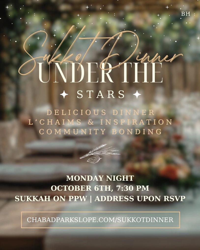 Enjoy a joyous evening filled with L'chaims, a delectable dinner, uplifting singing, and meaningful Chag Sukkot energy.